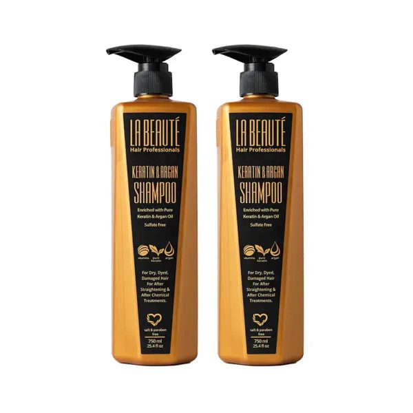 מארז זוגי במבצע של La Beaute – לה בוטה הכולל שני בקבוקי שמפו קרטין טהור ללא מלחים. מתאים לשיער יבש, פגום, צבוע או שעבר החלקה.